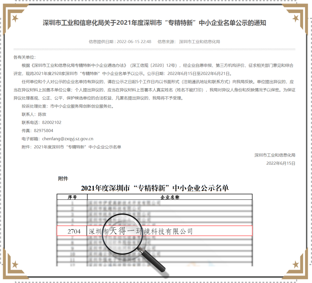 近日,深圳市工业和信息化局公布了2021年度深圳市“专精特新”中小企业名单,深圳市雷火竞技环境科技有限公司(简称雷火竞技)荣列其中。