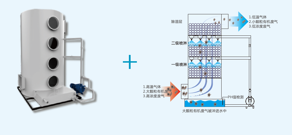 净化原理:利用气体与液体间的接触,将有机废气与被污染的液体分离净化。采用气液逆向吸收方式处理,即液体自塔顶向下以雾状(或小液滴)喷洒而下。废气则由塔体(逆向流)达到气液接触之目的; 此处理方式可冷却废气、去除颗粒及净化气体,再经过除雾段处理后,排入下一处理环节。