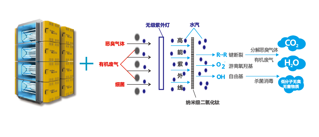 微波协同作用: 微波场的热效应使VOCs分子自身温度升高,能极大提高其氧化速度,而且它的离子化效应更为突出,可以极大提高VOCs分子原子的运动速度,提高VOCs分子与光子的撞击能量,使得VOCs快速氧化分解(1~2s内完成)。因此,工业排放的VOCs能在微波深紫外原子氧化下发生裂解、氧化、矿化成无机小分子、CO2和H2O。