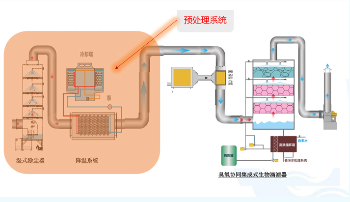 臭气预处理系统:采用具有专利优势的生物净化设备,该设备兼有了“生物滤池”和“生物滴滤池/生物洗涤器”的优势,但较“生物滤池”占地面积更小、较“生物滴滤池/生物洗涤器”营养盐消耗量更小。从而在保证效果的基础并解决了用地负荷的问题。