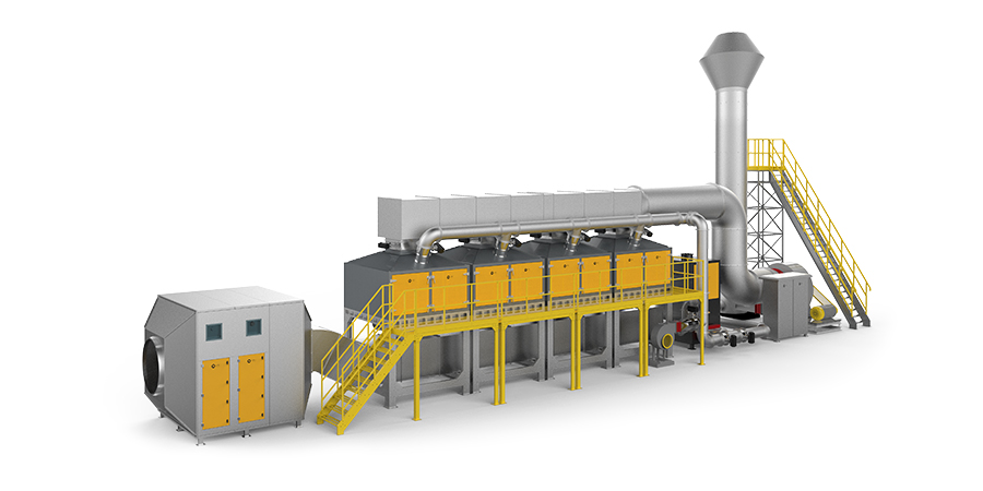 雷火竞技研发的固定式吸脱附床采用装填的颗粒活性炭、蜂窝活性炭或者沸石分子筛的吸附作用,吸附废气中的VOCs吸附剂吸附饱和后,采用热空气、热氮气进行脱附再生,脱附后的高浓度废气经燃烧设备(一般为催化燃烧CO设备)氧化分解。催化燃烧利用催化剂的作用降低氧化分解反应所需的活化能,有机废气在贵金属催化剂的作用下于260-400℃之间催化氧化为CO₂H₂O,并释放大量的热量,通过热交换器对热量进行再利用,适用范围:低浓度有机废气净化处理。
