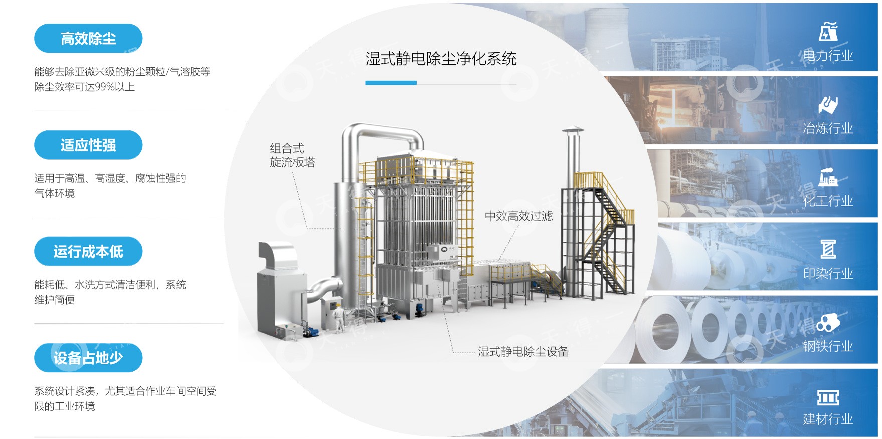 不同行业和规模的烟气成分和处理需求各异,通过精准分析每个工况的具体需求,我司可进行定制化的设计湿电参数和预处理工艺,确保所选技术方案能够有效运行,该设备广泛应用于电力、冶金、化工及印染等多个行业,能有效去除气溶胶,尘埃及细微颗粒物等污染物,主要用于处理烟气浓度大的场合,除尘效率高达99%以上。